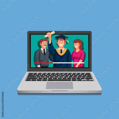 Student Graduation online on laptop streaming, academic in pandemic concept in cartoon illustration vector