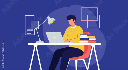 student, studying, desk, laptop, book, learning, education, office, room, interior, lamp, light, library, workspace, university, college, research, cognition, academic, sharpened, task, person, man, male, character, vector, illustration, flat, design, modern, remote, work, freelance, digital, technology, productivity, sitting, table, information, writing, development, literature, school, bookshelf