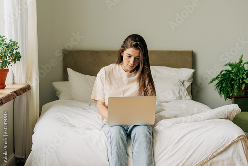 Student sitting on bed typing project in laptop, online learning, remote work from home