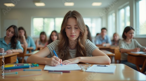 graduation, exam, student, bright, classroom, culmination, academic, education, learning, atmosphere, tool, cognition, environment, organised, modern, design, interior, vibrant, composition, engagement, material, arrangement, surface, vivid colors, lively, interactive, space, creativity, inspiration, layout, setup, detail, determination, concentration, school, class, group, study, teenage