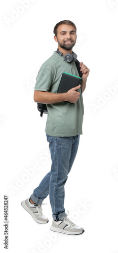 backpack, notebook, textbook, stationery, earphones, background, style, person, young, fashion, hipster, lifestyle, stylish, look, caucasian, school, student, casual attire, smart, education, study, university, college, learn, future, youth, clever, intelligent, scholarship, learner, white, isolated, happy, smiling, male, bearded, adult, man, book, holding, outfit, photogenic, studio, posing, full, length, cognition, academic
