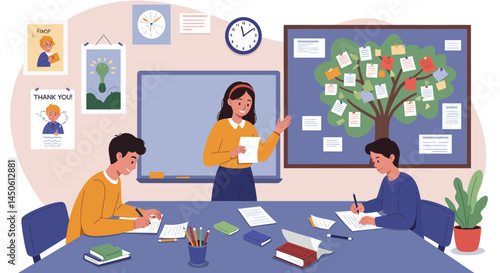 Student Writing at Desk with Posters and Classroom Elements, Studying.