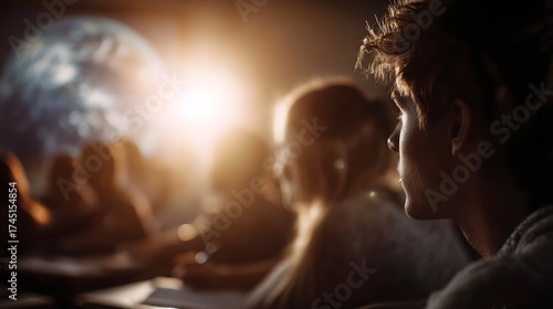 student, classroom, observe, projection, earth, people, youth, learning, education, audience, lecture, presentation, study, observing, profile, face, side, young, male, female, group, together, room, school, dark, indoor, desk, seat, screen, visual, light, bright, sun, glow, ray, warm, atmospheric, dramatic, bokeh, globe, planet, space, science, technology, cognition, future, global, perspective, awareness