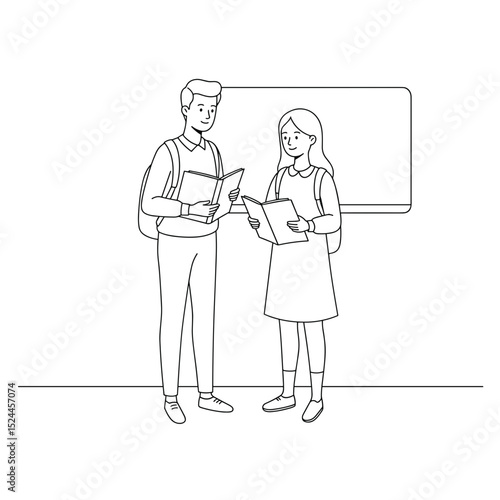 student, discussion, notebook, standing, education, young, interaction, collaboration, portrait, casual attire, teamwork, sharpened, learning, engagement, youth, character, academic, creativity, communication, classroom, informal, graphic, monochrome, line art, illustration, friendship, cooperation, active, motivation, study, inspiration, copy space