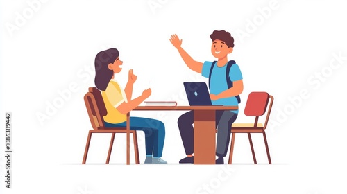 student, discussion, learning, education, conversation, communication, collaboration, classroom, school, meeting, technology, laptop, table, chair, people, girl, boy, happy, friendly, engaged, attentive, cognition, study