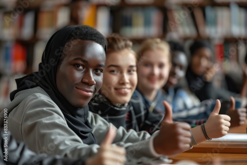 student, sitting, table, thumb up, library, education, young, friends, study, book, happy, smiling, learning, together, teamwork, success, college, university, positive, achievement, exam, information, cognition, research, resource, enthusiastic, motivated, supportive, group, diligent, creative, focused, working, hard-working, dedicated, helpful, encouraging, collaborative, determined, inspired, productive, innovative, intellectual, progress, modern, satisfied, confident, upbeat