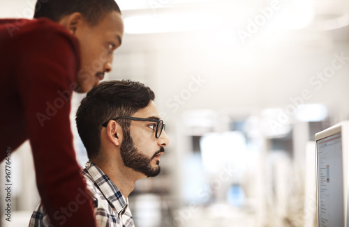 Students, tutor and advice in library on computer for higher information technology or college scholarship. School, teamwork or people learning on pc for research, solution or helping for online test