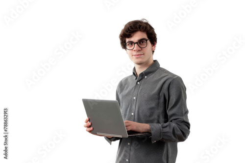 Studio portrait company worker smart young Caucasian man with chill style and serious face wearing casual outfits and holding laptop, isolated on transparent png background.