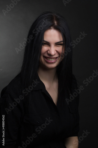 person, portrait, female, fashion, woman, dark, brunette, hair, studio, black, background, face, skin, model, young, looking, caucasian, photo, individuality, femininity, lady, cosmetic, long hair, chic, posh, expression, smile, fun, laugh, happy, cheerful, joy, emotion, rejoice, positive, excitement, laughter, abs