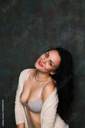 Studio portrait of a sexy brunette in grey lingerie and white cardigan
