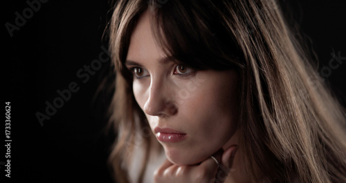 Studio portrait of a young female model posing with her hand on her chin, looking away from the camera with a serious expression
