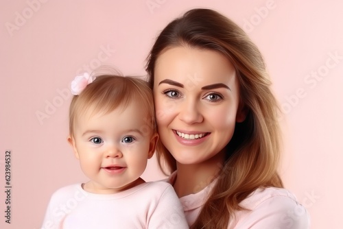Studio portrait of a young smile asian mother and happy child isolated on pastel pink wall background. Mom and baby embrace. Mother's Day. Loving parent, Generative AI