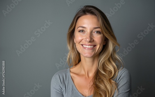 Studio portrait of an attractive middle age woman against grey background. High quality