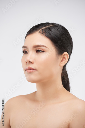 asian, vietnamese, woman, female, isolated, beauty, attractive, natural, skin, flawless, cosmetic, moisturiser, care, complexion, fresh, cosmetology, spa, naked, beautiful, treatment, unsmiling, studio, young, brunette, make-up