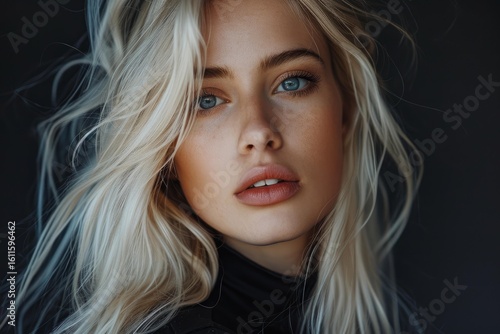 Studio portrait of beautiful young blonde woman with blue eyes and long hair posing on a dark background