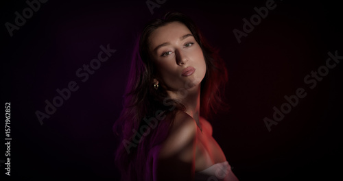 woman, model, fashion, beauty, portrait, studio, dark, neon, light, colourful, posing, long hair, coiffure, make-up, style, glamour, elegant, sensual, attractive, expression, face, eye, lip, shoulder, bare shoulder, skin, purple, red, shadow, background, studio shot, vertical, one person, young adult, caucasian, looking away, nightlife