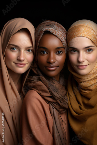 Studio portrait of three beautiful young Muslim women, all three wearing headscarves.