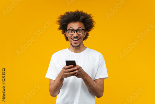Studio portrait of young smiling African American man in basic white t-shirt and trendy eyeglasses reading message on his mobile phone with amazed face expression