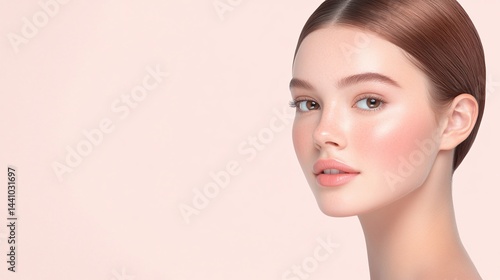 Studio portrait of young woman with sleek brunette hair in a low bun, soft pink background, glowing skin, minimal makeup, elegance and natural beauty concept