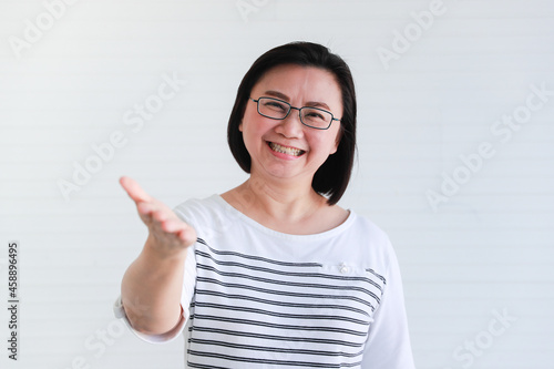 Studio portrait shot of Asian happy middle aged chubby plump senior female model in casual clothing and optical eyeglasses smiling show teeth hold hand up inviting welcome guest on white background