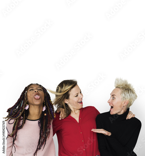 background, beautiful, best friend, buddy, casual attire, cheerful, confidence, diversity, fashion, female, feminism, friends, friendship, happiness, isolated, isolated on white, lady, lifestyle, model, person, positivity, race, shoot, smiling, studio, style, team, teamwork, togetherness, trendy, oneness, woman