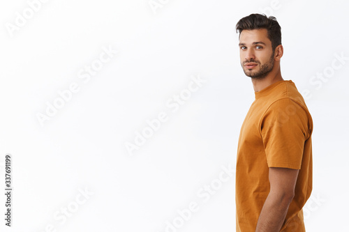 Studio shot charismatic hipster guy with beard in brown t-shirt, standing in profile left side, turning head at camera and smiling, see something interesting, turn attention to good promotion