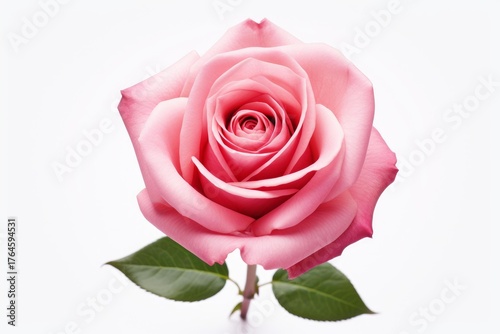 Studio shot of a beautiful pink rose with delicate petals and green leaves, isolated on a white background