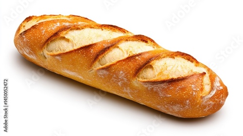 Studio shot of a freshly baked baguette with a golden crust, isolated on an ideal white background.