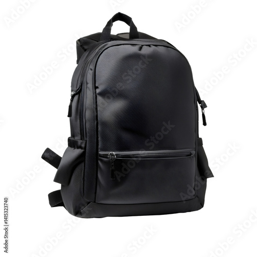 Studio shot of a practical black nylon backpack, ideal for students and professionals, isolated on a transparent background