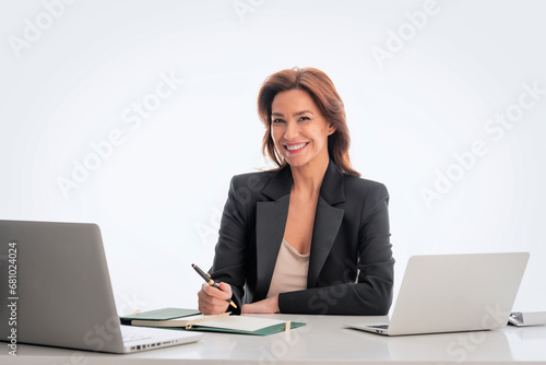 business, businesswoman, woman, woman, computer, laptop, notebook, cyberspace, writing, white background, working, work, middle-aged, mature, toothy smile, cheerful, smiling, smile, happy, beautiful, casual attire, confident, executive, female, people, person, secretary, attractive, financial, sale, assistant, professional occupation, portrait, sitting, desk, table, brunette, 40s