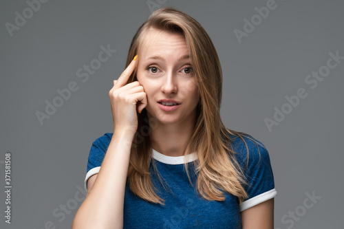 question, doubt, finger, thinks, thinking, thought, wonder, good, smiling, pointing, smile, idea, person, teenage, memory, happiness, looking, body, head, isolated, positive, finger, face, happy, point, female, confident, portrait, standing, smart, great, crazy, woman, young, camera, girl, adult, hand, blue, cheerful, concept, shirt, attractive, fashion, grey, casual attire, background, beautiful, oneself
