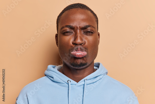 Studio shot of dark skinned man pouts lips frowns face expresses dissatisfaction being offended on someone wears blue sweatshirt isolated over brown background. Negative human emotions concept