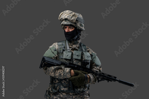 soldier, military, army, special, force, marin, infantry, man, war, conflict, warfare, rifle, camouflage, uniform, officer, serious, modern, terror, protect, defend, brave, looking, racked, service, studio, isolated, background, grey, grey, alone, front, horizontal