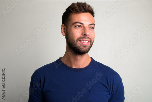 man, 20s, bearded, people, portrait, photogenic, beard, adult, blue, studio, shot, isolated, white, background, person, male, man, guy, young, attractive, stubble field, moustache, face, fashion, style, hipster, trendy, cool, macho, look, casual attire, shirt, thinks, thinking, happy, happiness, smile, smiling, closeup, head