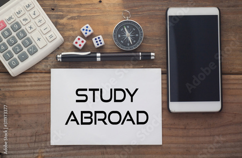 Study Abroad written on paper,Wooden background desk with calculator,dice,compass,smart phone and pen.Top view conceptual.