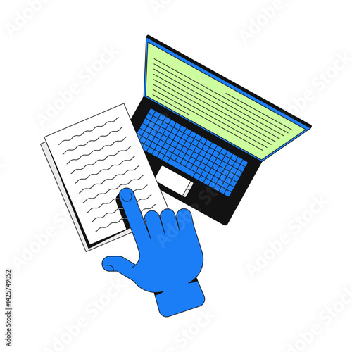 study, datum, document, processing, digitization, paperwork, laptop, finger, pointing, learning, tutorial, hand, educational, content, reading, interactive, instruction, course, guidance, input, mobile, app, illustration, vector, image, isolated, colourful, abstract, drawing, idea, creative, cartoon, flat, concept, isolated on white, editable, metaphor