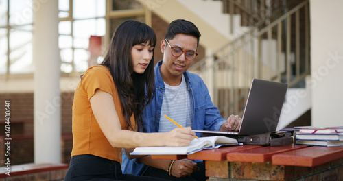 Studying, notes and students with books and laptop for learning, education and exam prep. Writing, university and woman with man on computer with textbooks for assignment, test or knowledge at school
