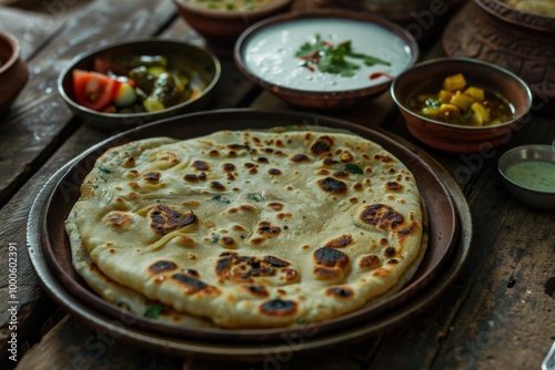 Stuffed Indian paratha served with spiced paneer cubes, yogurt, and fresh coriander for a hearty traditional meal