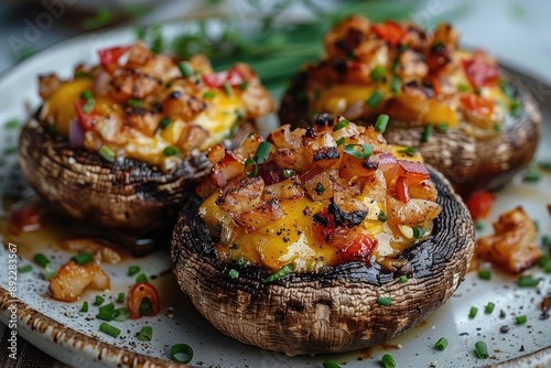 mushroom, stuffed, cheese, bacon, red, pepper, onion, green, chives, savoury, delicious, food, meal, dinner, receipe, epicure, baked, grilled, healthy, vegetarian, vegan, fungal, cookery, dish, plate, white, brown, texture, closeup, macro, photo, edible, tasty, favor, aroma, organic, fresh, art, design, illustration, graphic, creative, image, picture, visual
