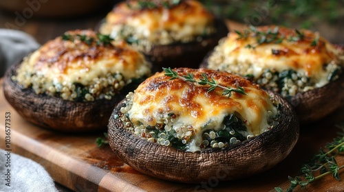 Stuffed portobello mushrooms filled with spinach, quinoa, and topped with melted cheese, garnished with fresh thyme