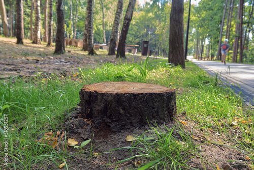 Stump, felled wood, landscaping in the park. Forest, a place for rest, relaxation and sports. Walkway, paved path