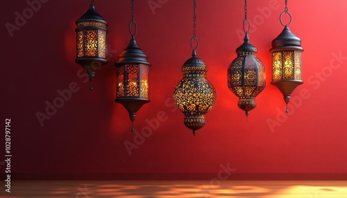 Stunning 3D Ramadan lanterns against a vibrant red backdrop