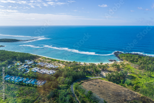 Stunning aerial view of the coastline showcasing lush green vegetation, turquoise waters and white sandy beaches. This photo captures the beauty of the island's natural landscape. Mauritius, Africa.