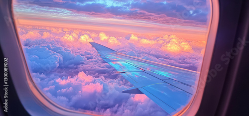Stunning Airplane Window View – Fluffy White Clouds, Radiant Sunrise or Sunset, and Airplane Wing Soaring Towards the Horizon, Evoking a Sense of Freedom and Adventure