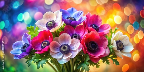 bouquet, anemone, flower, bokeh, floral, photo, beautiful, vibrant, colours, hi-res, nature, spring, summer, garden, still life, macro, closeup, red, pink, purple, white, orange, yellow, floral arrangement, floral pattern, romantic, elegant, artistic, decorative, image, digital artwork, realistic, photorealistic, art, design, decor, wallpaper, background, poster, print, home decor