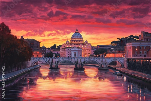 vatican city, roma, italy, sunset, sunrise, bridge, city landscape, architecture, travel, art, painting, colourful, dramatic, calm, tranquil, scenic, evening, beautiful, european, artistic, tourist destination, watercolor, impressionism, romantic, vibrant, red, orange, pink, yellow, warm colors, city view, river, europa, landscape, illustration, fine art, beautiful sunset, tourist attraction, european city, closeup