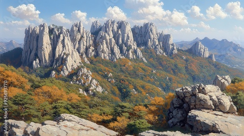 Stunning Autumn Landscape of Rocky Mountains with Majestic Cliffs and Dense Forest Under Clear Blue Sky with Fluffy Clouds