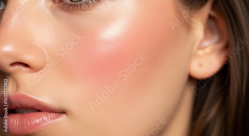 Stunning beauty portrait of a woman with flawless, glowing skin, highlighting her cheekbones with a natural pink blush