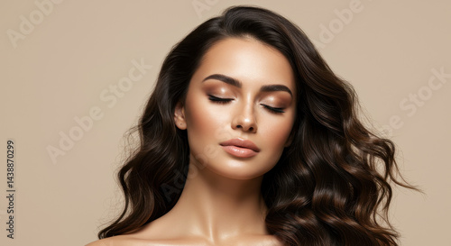 Stunning Beauty: Radiant Skin, Brown Wavy Hair, & Perfect Makeup. Eyes Closed - Calm, Serene, Glamorous Portrait