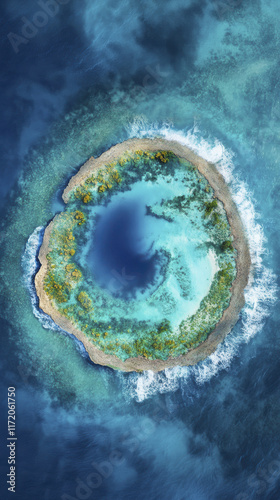 stunning birds eye view of vibrant coral atoll surrounded by deep blue ocean waters, showcasing natural beauty and rich marine life of this tropical paradise